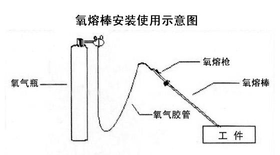 氧熔棒需要配合氧熔槍和氧氣瓶才能使用,因此,在使用氧熔棒之前,我們首先要對(duì)其進(jìn)行正確安裝,下圖是氧熔棒工作時(shí)的安裝示意圖。